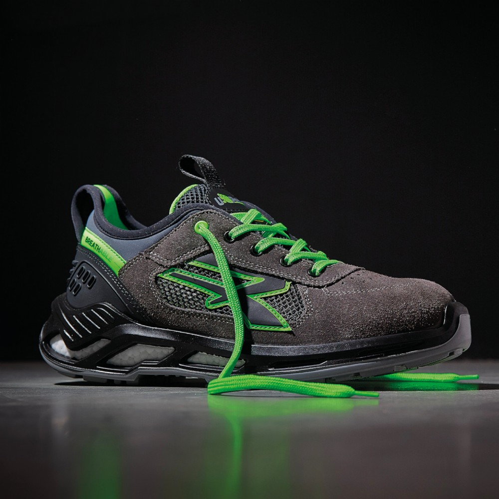 Scarpe Naos antinfortunistiche basse, leggere e comode U-Power della linea Red 360, con tomaia in pelle nabuk naturale bottalato, idrorepellente, collarino in Lycra e tallonetta anti-shock, puntale in alluminio, antiperforazione, antiscivolo e suola PU/PU infinergy, S3 SRC CI ESD.