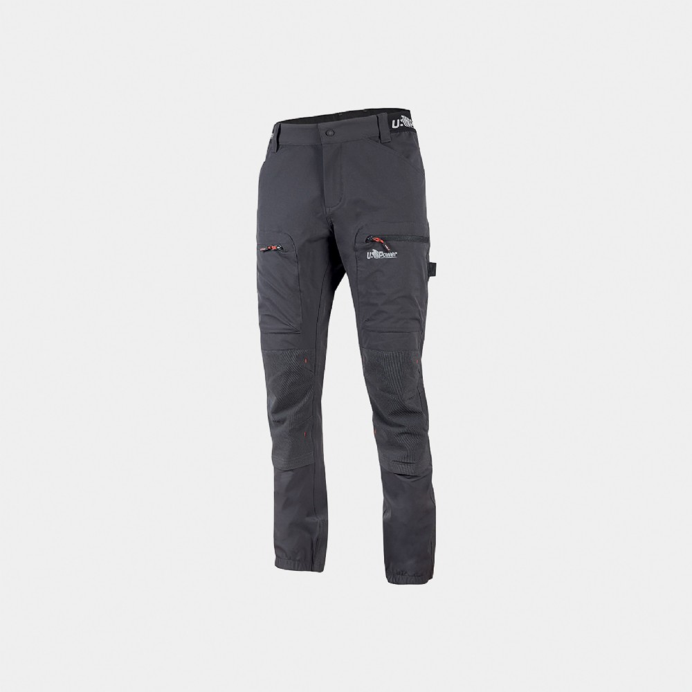Pantaloni da lavoro stretch in tessuto U-4 con vestibilità jogging e inserti elasticizzati in vita e sul fondo per offrire una migliore vestibilità. Chiusura centrale con zip e bottone gommato antigraffio.