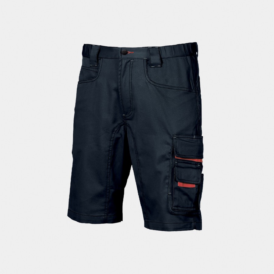 Bermuda dotato di 2 ampie tasche anteriori, tasca laterale portautensili, tasca laterale multifunzionale, portabadge, 2 tasche posteriori con chiusura di sicurezza a velcro; porta martello regolabile; regolazione in vita con elastico per massimo comfort. Chiusura centrale con zip e bottone gommato antigraffio
